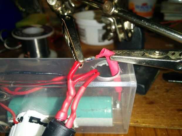 Encontrado una 18650 azul con cables conectados. Cortada la batería naranja y soldadas en el azul. Trabajando una vez más.
