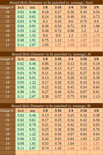 La tabla muestra la gama de diámetros de taladro, la herramienta se espera que produzca un determinado material y el grosor. El texto en rojo los números están por encima del rango de presión nominal, pero pueden ser opcionales, dependiendo. Esta medida debe ser alcanzable sin ningún amplificador de apalancamiento adicional como una sección de la tubería para aumentar la longitud de la manija, pero nuevamente, necesidades individuales pueden determinar lo contrario. El material de lubricante antes de perforar metales puede o no puede hacer más fácil el esfuerzo, pero se cree para prolongar la vida de golpe.