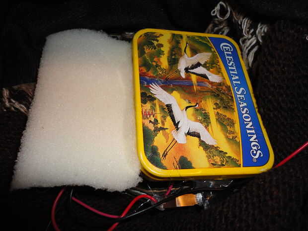 Pegamento sólo en sus componentes, dejando el cable de la batería y el cable de conexión de medios sin pegar, le paso estas detrás a través de la lana por lo que podemos acceder desde el exterior del sombrero. Pegar un pequeño trozo de espuma en la placa de circuito, no quiero cualquier poco avispado de soldadura o meter a nosotros a través del revestimiento de la tela de alambre.
