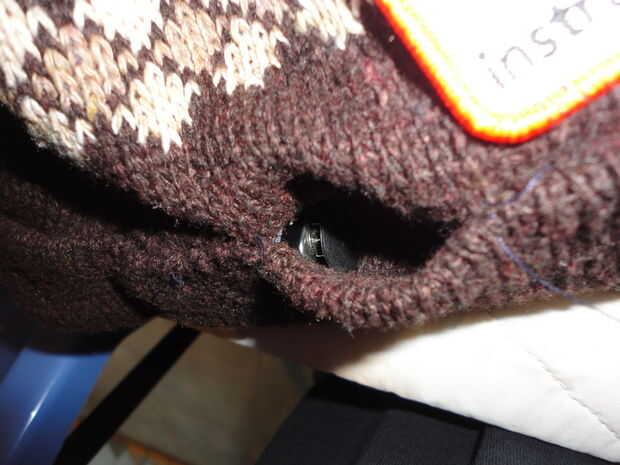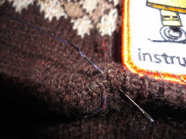 Aquí le damos un pequeño truco para hacer un nudo cuando se clava con tachuelas algo. Hacer un lazo con su aguja y luego Envuelva el hilo alrededor de la aguja que sobresale un par de veces antes de tirar a través.