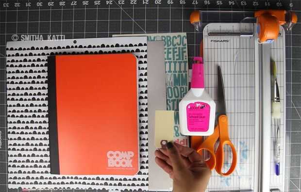 Los suministros que necesitará para esto son: un cuaderno de composición o un notebook de todo tipo, algunos papeles de scrapbooking, etiquetas engomadas de la carta, pegamento blanco, un par de tijeras, una cizalla, un pincel y una etiqueta de envío.