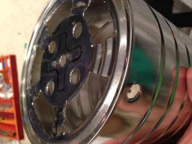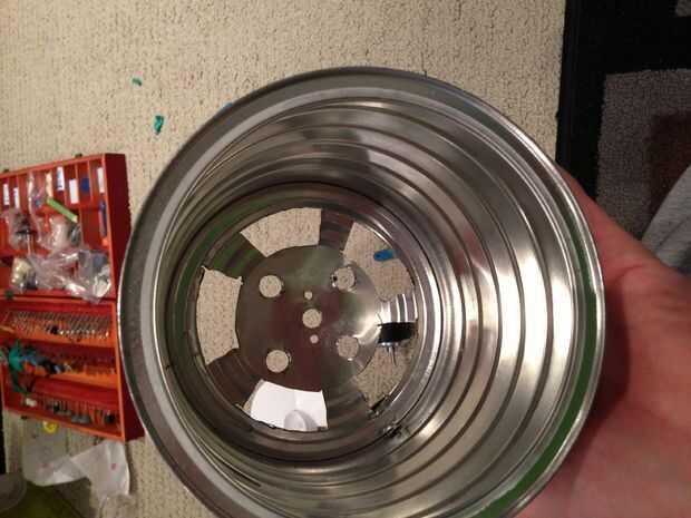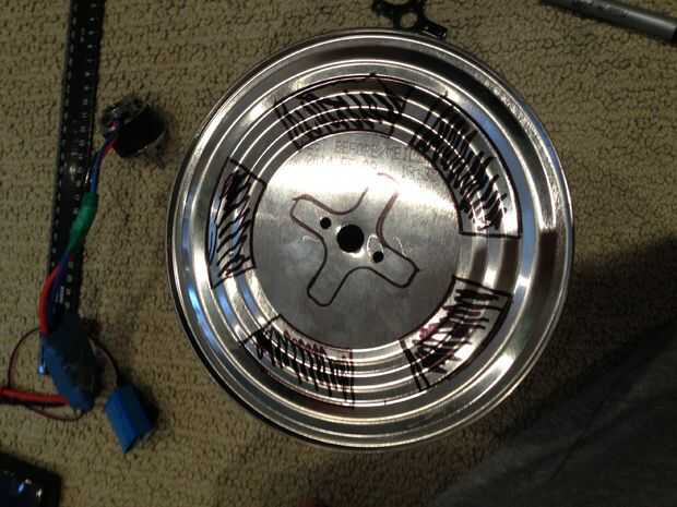 hacer marcas en la parte inferior de la lata para los orificios de entrada de aire y uno en el lado para el motor los cables entonces corte/taladro hacia fuera las formas con una herramienta dremel
