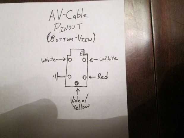 Después de hacer algunas pruebas y buscar hojas de datos, logré averiguar el pinout para el conector de AV. En el tablero, hay 5 puntos de soldadura que el jack de 3,5 mm en el lugar.