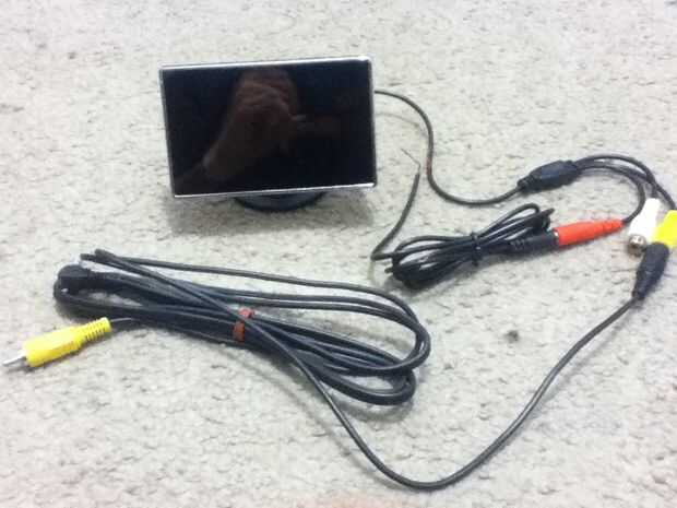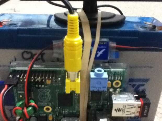 Ahora en el monitor. Le enchufamos a la clavija de corriente en el enchufe correspondiente cosita, luego le enchufamos en un lado del cable RCA a la entrada amarilla (el blanco que uno estaba allí en caso de que quería una segunda entrada). Luego, aseguró al monitor en la parte superior de la batería deslizando la base entre dos bandas de goma. Y para finalizar aquí, conecté al otro lado del cable RCA a salida analógica de la frambuesa pi. Ahora en mi caso, tuve la suerte que este monitor de coche de 12 voltios era capaz de ejecutar bien con sólo una batería de 6 voltios, de lo contrario hubiera tenido que quitar el regulador de tensión interna en el monitor.