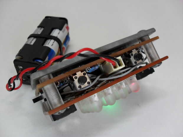 Utiliza sólo un IC y un PIC16F628A 9 transistores bipolares, tiene 4 botones para el control y un interruptor para apagarlo.