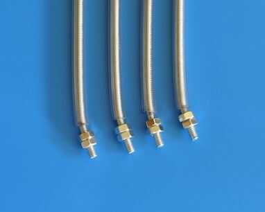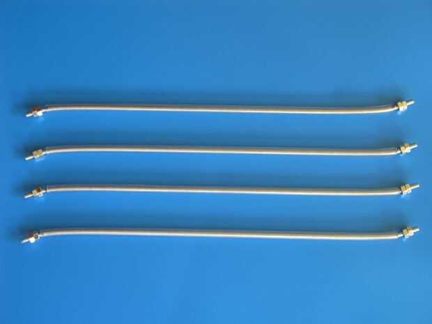Corte cada varilla 36" roscada en dos; ahora tiene cuatro barras de 18". Redondear los extremos cortados con una Lima. Revise los hilos de rosca del corte termina con una tuerca. (Que tenga que aplicar la tuerca en el extremo opuesto, y luego correr hacia arriba y fuera el extremo recién cortado). Marque cada varilla en 1" de cada extremo. Corte cuatro 16" longitud de la tubería de Tygon. Deslice el tubo sobre cada barra. Use un trozo de 1" de la tubería para proteger las roscas expuestas en el proceso de modelado. Doble un extremo de cada varilla en la marca a unos 20° hacia arriba de la recta. (Deslice la pieza de tubería corta sobre el final antes de sujeción de la mordaza o alicates. Mantener el exterior ¾" de la barra lo más recto posible.) Doble el extremo desplegado de cada barra, en la marca, a unos 20° abajo de recta. (Doblar en la dirección opuesta de la primera curva! Mantener el exterior ¾" de la barra lo más recto posible.) Enrosque dos tornillos en cada extremo de las barras. Cortar cada 36" varilla roscada en dos; ahora tiene cuatro barras de 18". Redondear los extremos cortados con una Lima. Revise los hilos de rosca del corte termina con una tuerca. (Que tenga que aplicar la tuerca en el extremo opuesto, y luego correr hacia arriba y fuera el extremo recién cortado). Marque cada varilla en 1" de cada extremo. Corte cuatro 16" longitud de la tubería de Tygon. Deslice el tubo sobre cada barra. Use un trozo de 1" de la tubería para proteger las roscas expuestas en el proceso de modelado. Doble un extremo de cada varilla en la marca a unos 20° hacia arriba de la recta. (Deslice la pieza de tubería corta sobre el final antes de sujeción de la mordaza o alicates. Mantener el exterior ¾" de la barra lo más recto posible.) Doble el extremo desplegado de cada barra, en la marca, a unos 20° abajo de recta. (Doblar en la dirección opuesta de la primera curva! Mantener el exterior ¾" de la barra lo más recto posible.) Enrosque dos tornillos en cada extremo de las barras.