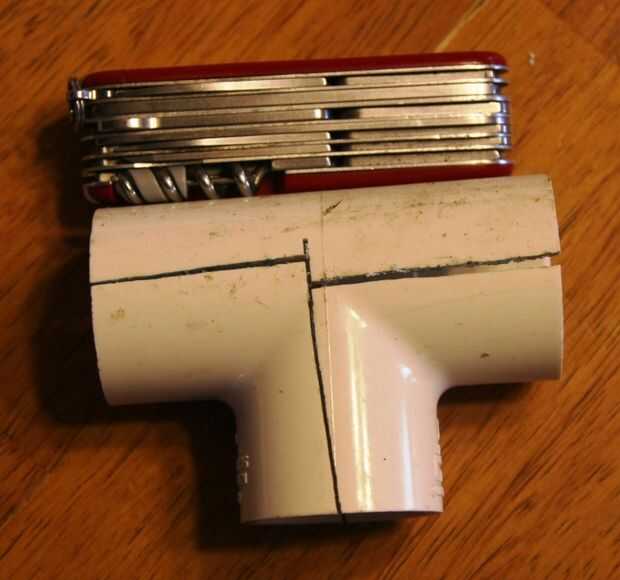Tazas se necesitan para sostener los extremos de la barra transversal a los montantes pero todavía permite la barra transversal a ser derribado si el perro golpea. Hice las tazas de 1" PVC Tees haciendo dos cortes (en realidad tres, como se hizo en dos partes. Cada T ofrece dos tazas. Uno hecho medio camino abajo del eje de corte, revocó la t en mi mordaza e hizo otra en el lado opuesto. Si eres altamente calificados, a diferencia de mí, puede hacer los cortes de eje largo conectar perfectamente. Hice otro corte perpendicular a éstos hacia abajo el eje más corto como se muestra en la ilustración. Presentar los bordes hasta que fueron lo más suaves que necesitaba que fueran.