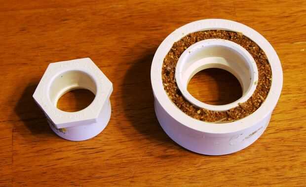A menudo se estabilizan las columnas con una T, C o matriz en forma de tubo de PVC y una barra transversal baja es pegada en para la buena medida. Aunque muy estable, estos tipos de bases hacen todo abultado. En primer lugar, me puse los tapones de los extremos superiores de los postes en el 36". Compré los bujes para crear una base para cada vertical. Puse los casquillos de 1 "x 2" en los extremos inferiores de los montantes, seguidos de los bujes de 2 "x 3". Para agregar peso y mejorar la estabilidad, he vertido de arena en los bordes de los bujes de 2 "x 3" y cubiertos con cola blanca de madera para sostenerlo en lugar. Estos solo funcionan bien en una superficie plana tal como concreto, pero quería utilizar al aire libre en mi jardin nivel decididamente no. Tengo unas placas de plástico picnic viejo (fácilmente obtenidas en una tienda de segunda mano) y pegado a la parte inferior para aumentar la superficie. Tuve que recorte un poco el centro de cada placa en mi caso, pero después que el buje 2 "x 3" pasó a encajar perfectamente. Pegué en (no permanente) con pegamento de silicona. Usted podría comprar un reborde del inodoro con 3" de diámetro para cada lado en lugar de utilizar las placas.