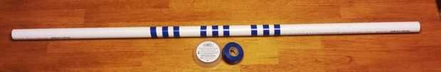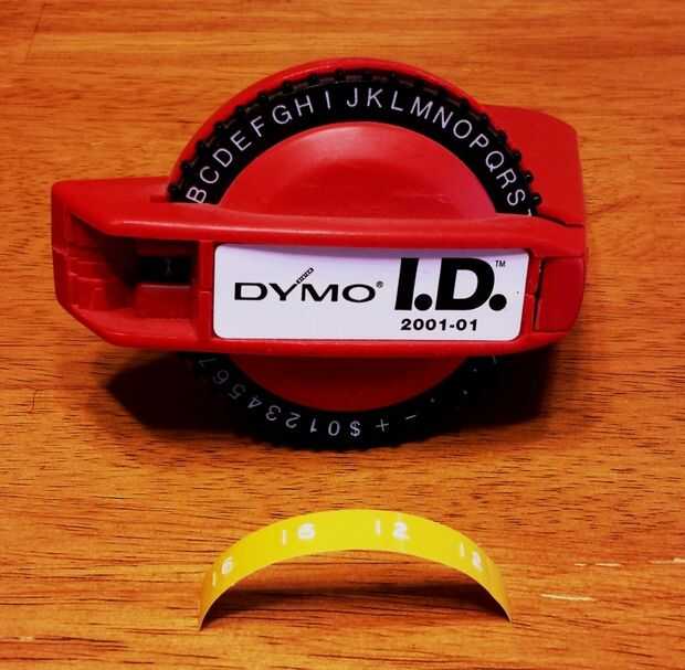 Una vez que las bases fueron acabadas, he medido y había marcado los montantes para varias alturas de salto. Alturas estándar son 8, 12, 16, 20, 25 y 26 pulgadas. Tengo este nifty, vieja escuela, Dymo label maker y hacer las etiquetas para 12" y 16" alturas. Usé cinta aislante de colores para marcar la barra transversal de manera contrastante.