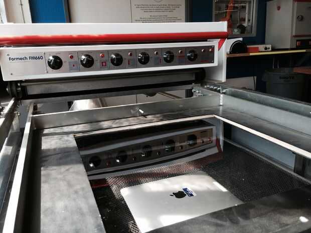 El vacío que forma el hecho aquí es el proceso tradicional - calor el plástico, colocar el plástico sobre el iPad, elevar la cama con el iPad y succión para crear un vacío en el iPad y el plástico en lugar de tirar.