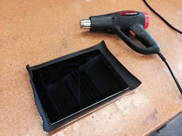 Como una mejora del diseño para este photobooth, quería ser capaz de sostener el iPad cerca y con seguridad para el láser corte marco. Tuve una idea que vacío formando un iPad hacer esto muy bien pero era caprichosa trata de poner una normal, iPad trabajo bajo plástico caliente con la succión. Imaginaba la pantalla hacer estallar o el calor causando otros problemas. Me llegó a mi red y llegó a mis manos sobre un iPad roto para crear el plástico formado para sostener el iPad en su lugar. Esto funcionó muy bien! Ya que usé un iPad1, también formó un pedazo de espuma utilizando una pistola de calor para calentar la espuma y apreté entre mis dos formas plásticas para fijar el iPad2 de mi trabajo. Esto también significa que el photobooth trabaja ahora para los modelos de iPad 1 y 2.
