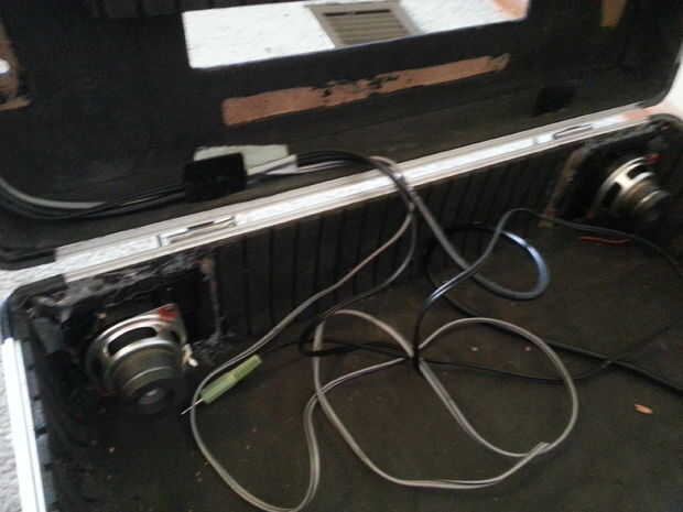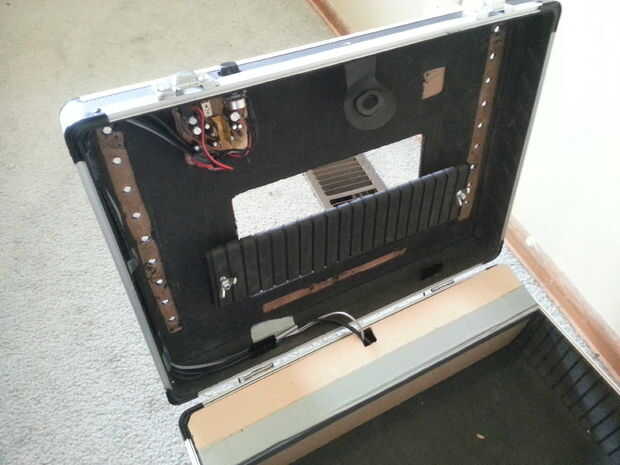 Para los altavoces, me cortar la caja del altavoz y pegado la porción de la parrilla delantera a la maleta y tuve algo más sólido para conectar los altavoces. He conectado el control de volumen en la parte superior de la tapa y cortar un agujero en la parte superior de la perilla de volumen sobresalga para facilitar el acceso.