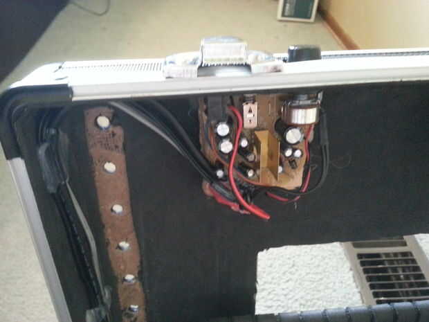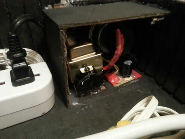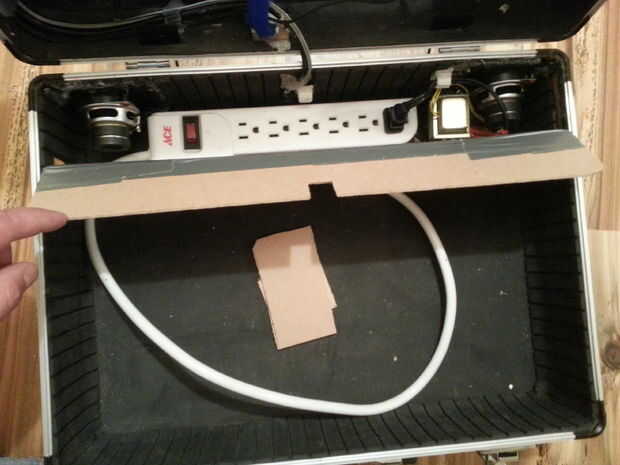 La regleta, altavoces y transformadores encajan muy bien detrás del divisor que hice. Fue agradable que el caso tenía ranuras en los lados.