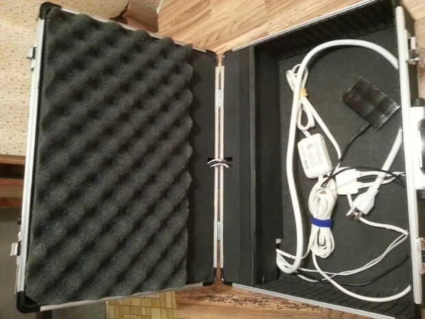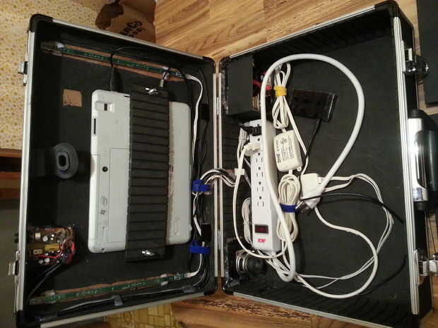 Quería usar la parte de la maleta para el almacenamiento de la impresora, así que tuve que averiguar una forma de administrar el cableado que no quiero cortar. Pongo todo (excepto la cámara) en el caso, junto con todo el cableado necesario para ver que todo estaba implicado. Desde allí pudo averiguar cuánto espacio los hilos y tomar ladrillos de poder.