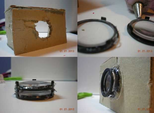 También tienes que pegar cada lente a sus anillos (con la parte curva hacia arriba) y luego proceder a pegarles, uno encima del otro. Tenga en cuenta que la caja de cartón no es la vivienda real y sólo se utilizará para marcar el tamaño y la forma de su cubierta flexible. Luego proceder a pegar la lente en un agujero que usted debe recortar de la caja. Asegúrese de que el agujero quede centrado o tu imagen no será perfecto.