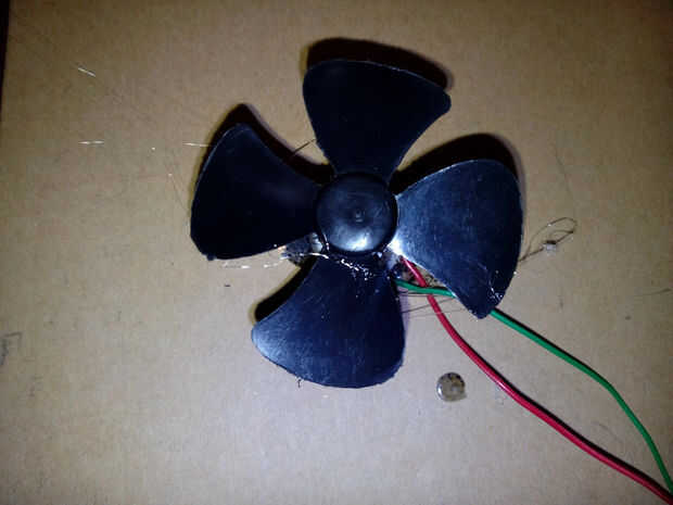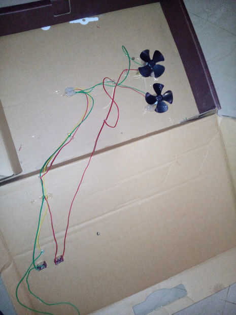 Motor de corriente continua de toma y cable asegurarán de que usted debe soldarlos cada como se muestra en la imagen. Después de Fije las turbinas y coloque el lado del extremo izquierdo de la caja de cartón con la ayuda de la pistola de pegamento caliente.