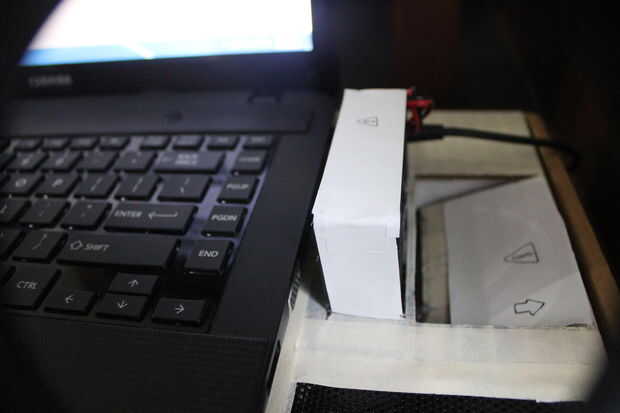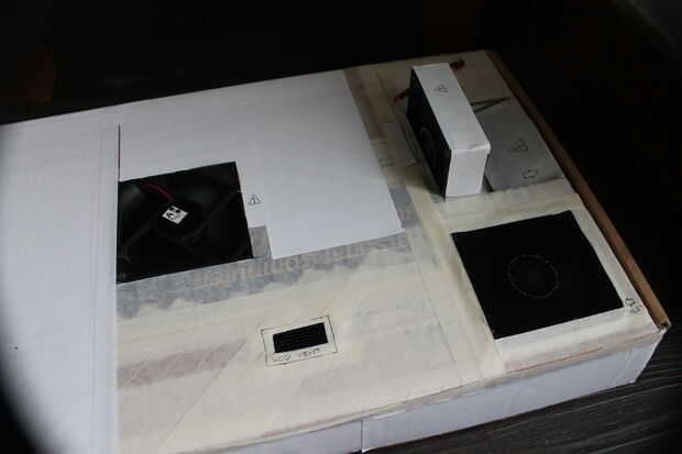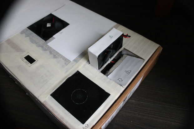 Asamblea no fue planeada así que no puedo hacer un procedimiento paso a paso. Y la aerodinámica no fue hecha por un experto (porque no soy un experto en ello). Sólo coloqué un ventilador de entrada de aire y otro ventilador para soplar aire hacia fuera de la caja dirigida por debajo de la laptop. Y otro ventilador para ventilación de la laptop.