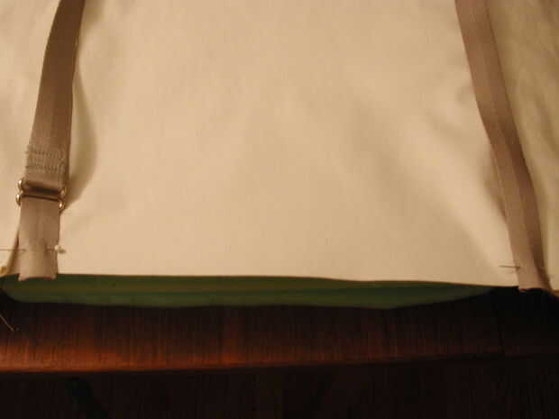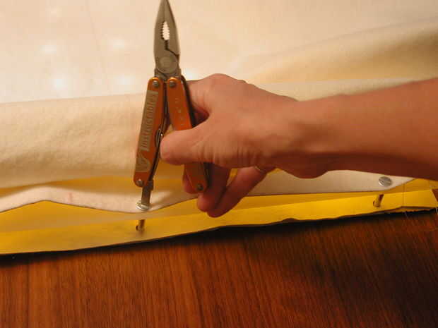 Arrastrarse por debajo de su superficie superior blanco y asegure cuidadosamente los orificios previamente perforados, ocultados bajo la tapa costura a su plexi. Usted desea utilizar su herramienta multiusos handly de Instructables para apretar los bornes. Ahora tienes que apilar el centro el sándwich de LED de plexi y vinilo gris derecha hacia fuera en el marco de espuma verde. Encontrar el interruptor y fije el cuello/dosel. Cuidadosamente Alinee los bordes en pin y doble 1/2" dentro de la vuelta y use un dedal porque se trata de cuatro capas de vinilo! Inserte los extremos de sus manijas en la costura en uno de los lados del centro. Mover este sistema a su máquina y parte superior coser borde exterior alrededor de todo el camino.
