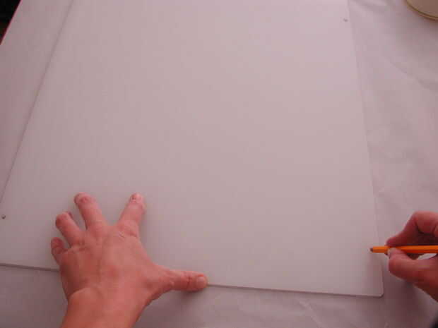 Usted querrá Taladre orificios de 3/16 - ish para aceptar tornillos roscados de sus postes. Estos servirá también como las "patas" de la tabla. Usé 8 agujeros, 4 centros de lado y los otros situado en dos pulgadas de los extremos del lado 18.5 largo. Es una buena idea para localizar la parte superior y marque donde se encuentran los agujeros esto utilizarás más adelante. Tomar el rastro y marque las ubicaciones de los agujeros en las piezas laterales del marco del vinilo blanco que sólo se cortan.