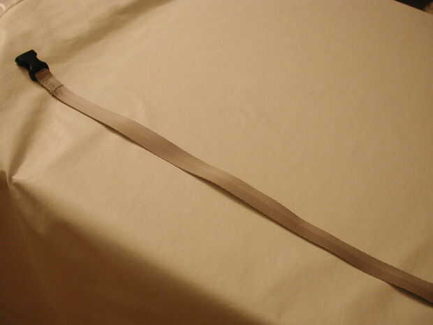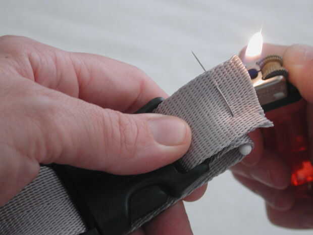 Uno cortado por la mitad otra vez quemar los bordes cortados a sellarlas con un encendedor y coser a una hebilla clip negro y reforzar con unas puntadas más.