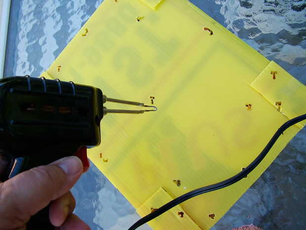 Ahora uso una pistola de soldar, Cautín, alicates y clavo caliente todo lo que tienes, para empujar los agujeros a través de todas las cuatro capas. Uso cuidado, sentido común, precaución y no trabaje en o cerca de materiales inflamables.