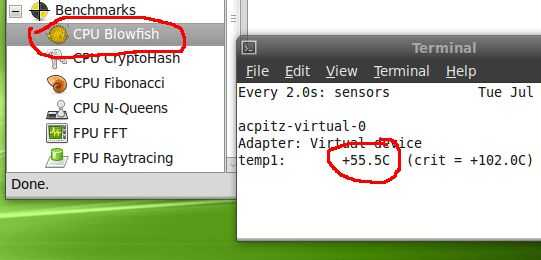 Incluso ejecutando Blowfish mi procesador portátil sólo calienta de 35,5 C al ralentí a 55,5 C y entonces rápidamente se enfría derecho hacia abajo otra vez.