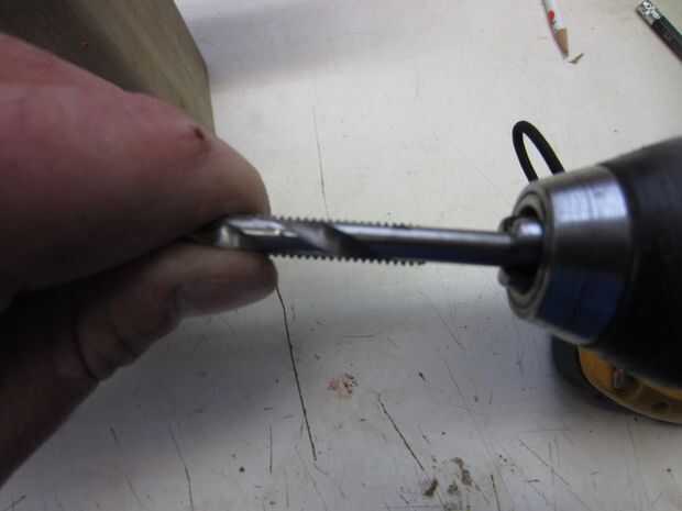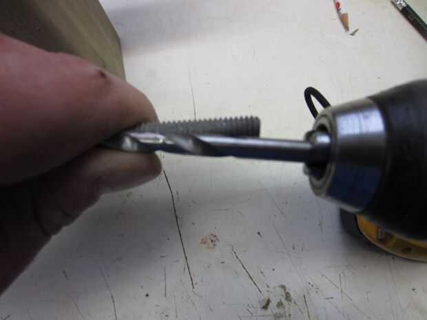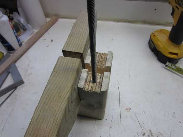 Ahora necesitas hacer un agujero para el tornillo en. Asegúrese de utilizar el tamaño correcto de broca a pre-taladre el agujero para que el tornillo entra fácilmente y no tirar cuando usted apriete el tornillo de banco (ver imagen). Centro del agujero en un lado de la muesca en el 4 x 4 (ver imagen). Taladre el agujero de unos 2-3 pulgadas de profundidad, y luego giro en el tornillo con unos alicates tornillo apretones (o incluso con su taladro inalámbrico). El tornillo debe ser ajustado en 4 x 4, si no es usted puede necesita para intentarlo de nuevo el otro lado, o pegamento en su lugar. Cuidadosamente corte el hilo de todo un poco inferior a la parte superior de la afinación tornillo para que tu tabla de snowboard no conseguir rasguñado por él.