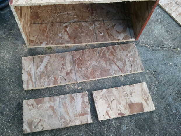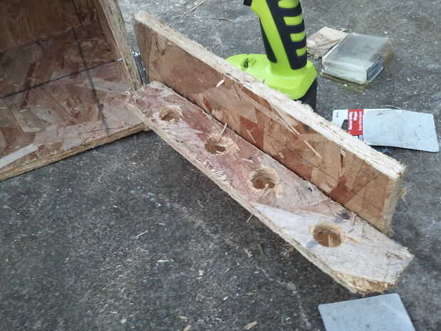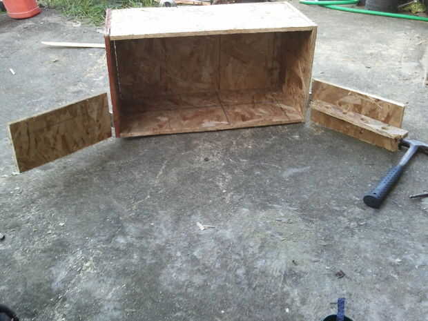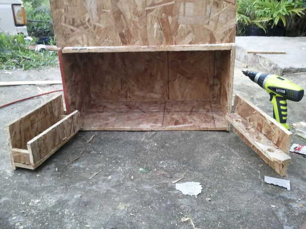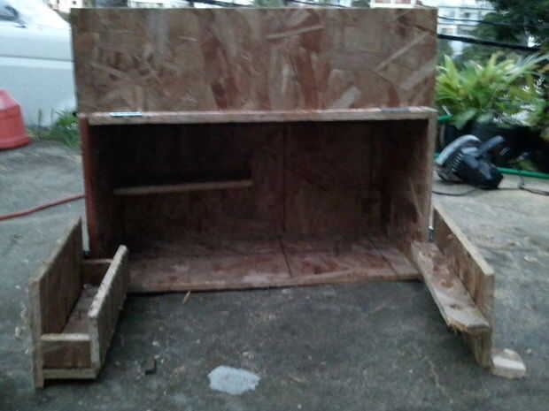 Para el panel de la izquierda bien haciendo un cubículo para sujetar tus cosas como cables, soldar y otras cosas. Primero se corta una pieza para la parte inferior y el frente ambos mismo tamaño hacerlos estrechos pero no pequeños. Luego corta dos trozos más pequeños para el lado y clavo todo juntos.