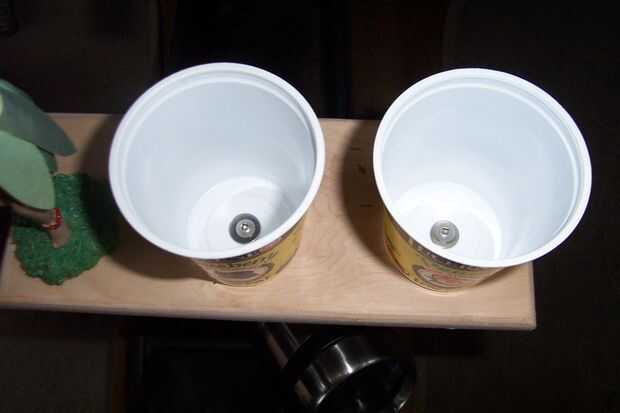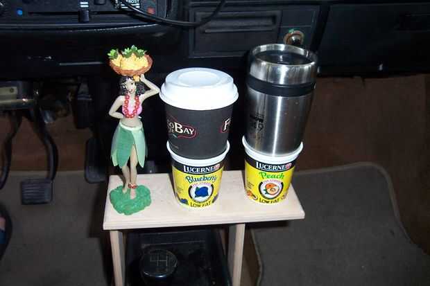 no pude encontrar un apoyavasos que encajarían mi 79 diesel de conejo, así que me puse todo alrededor de mi tienda. Originalmente iba a usar las tazas de yogur como plantilla para cortar agujeros en el pywood, pero luego me di cuenta de cómo tenazmente agarraron las tazas. Sólo les atornillan a la parte superior de un soporte de madera contrachapada simplemente para llegar a la altura correcta. Incluso dejé espacio para mi niña de hula poco (adhesivo caliente).