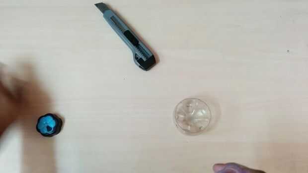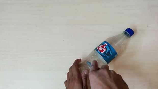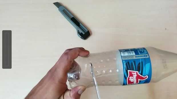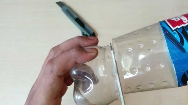 Primero se corta una pequeña porción en la parte inferior de la botella de plástico de coca cola por el cortador de la caja