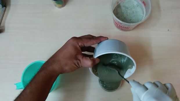 Vierta el lequid de cemento en el molde. Vibrar el molde lentamente. Vibratorio elimina las burbujas de la mezcla y lo hace el sostenedor de vela más fuerte y menos propenso a romper.