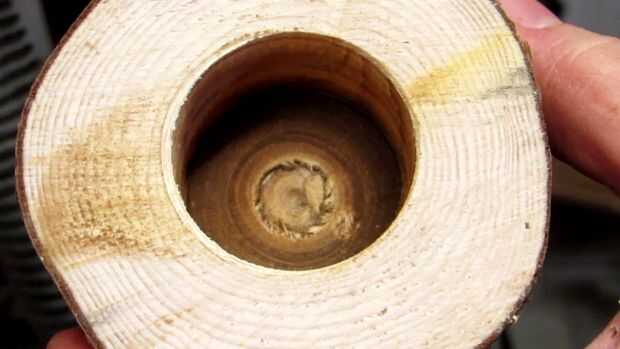 - Utilice una broca de pala para cerdo material. Eligió un poco que es lo suficientemente pequeño como para que el estímulo puede penetrar en la madera sin deriva en el agujero del centro, mientras que todavía lo suficientemente grande como para remover el material cerca de la línea exterior.