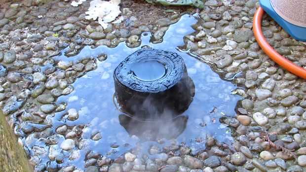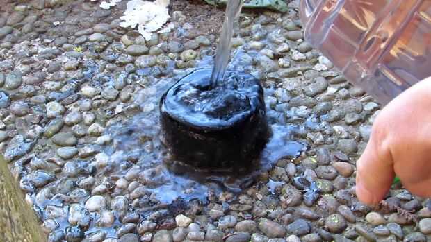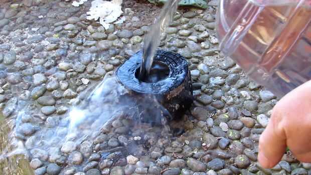 Moje la madera quemado con agua. Frío agua, preferiblemente, pero como es líquido debe servir para enfriar esta pieza. Usé agua forma nuestro barril de agua de lluvia, que ya estaba fría y barata para arrancar. Asegúrese de que a la pieza de trabajo bien y llenar el agujero - una gran cantidad de agua debe desaparecer en las grietas.