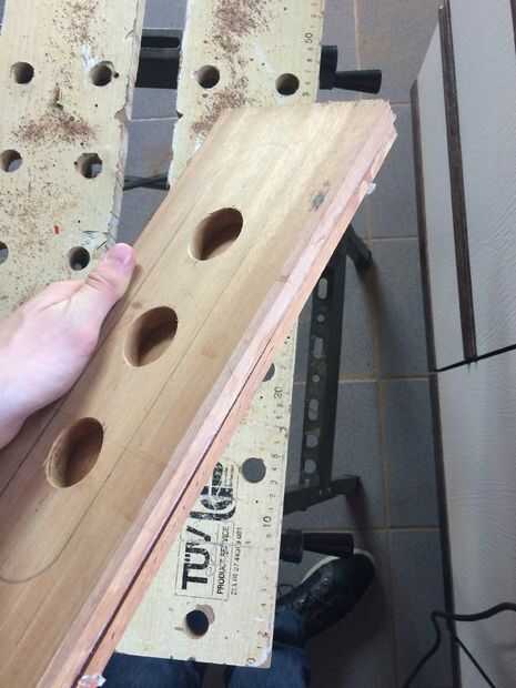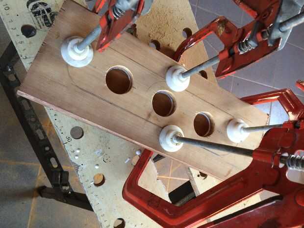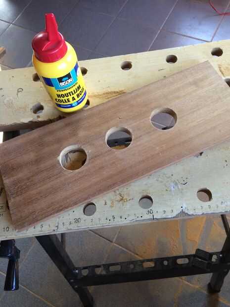 Después de que ha perforado los agujeros, puede pegar el tablón con los agujeros en la parte superior el otro tablón. Pero asegúrese de que usted todavía puede ver los dibujos para saber donde tienes que verlo. Y como se puede ver en la imagen, como siempre mucha cola!