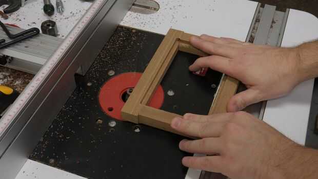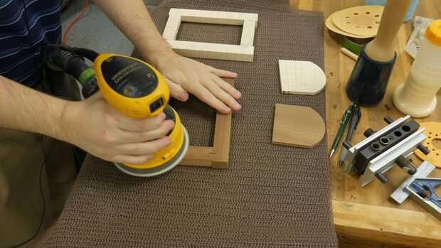Con el pegamento secado, he encontrado esto para ser el mejor momento para hacer cualquier lijado final del marco. Solía 80, 120 y 180 grano arena papeles en mi lijadora orbital liso marco y al estante. Doblé en los bordes exteriores con mi 1/8" redondo sobre pedacito en la mesa de fresadora.