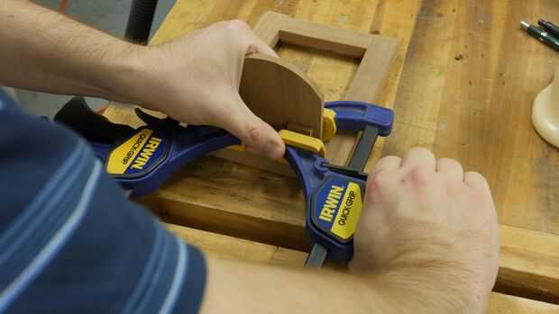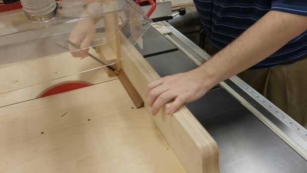 Los soportes fueron fabricados usando una cala de radio 1/2" broca en la mesa de fresadora. Puesto que las dimensiones de los soportes son de 3/4 "x 3/4" x 3/4", opté por cortar en la mesa de la sierra con mi cruz corte trineo. Les pegué sobre inserción 1/4 del borde de la plataforma.