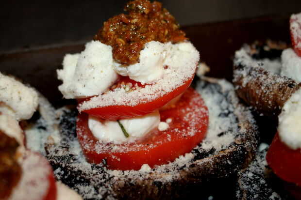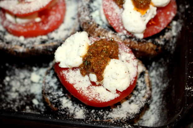 Poner las setas en una fuente refractaria engrasada y poner una rodaja de tomate en, que añada algunos mozzarella y repetir. Sazone bien, espolvorear con queso parmesano rallado y añadir 1 cucharadita de Pesto.