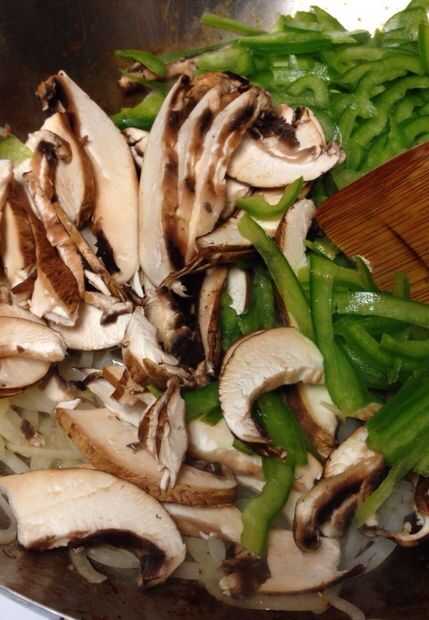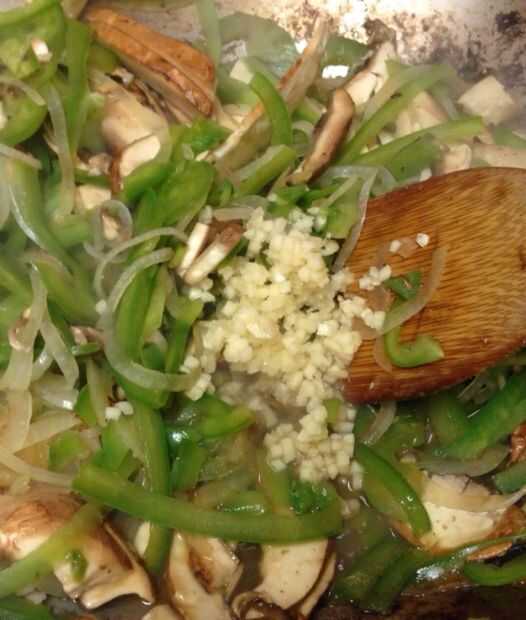 Añadir los pimientos, ajo y champiñones en rodajas. Rehogar la mezcla durante aproximadamente 6 minutos.