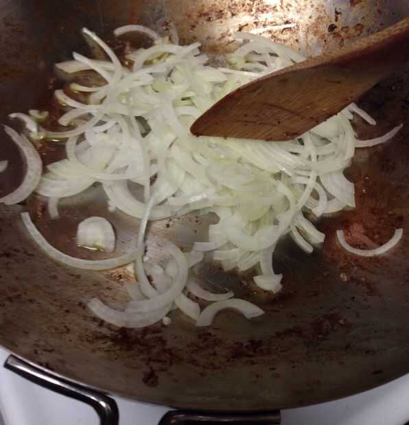 Utilizando la misma sartén, agregar la otra cucharada de aceite de oliva. Agregar la cebolla en rodajas y rehogar durante unos pocos minutos.