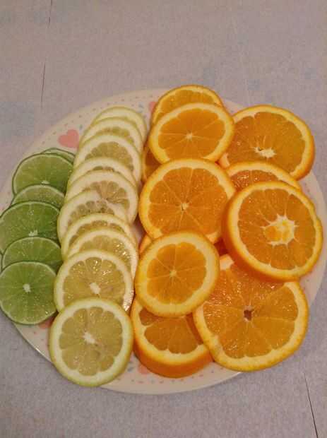 Cortar naranjas, manzanas, limones y limas en círculos delgados. Dependiendo de sus gustos personales, pueden alterar la cantidad/combinación de ingredientes para darle un sabor único.