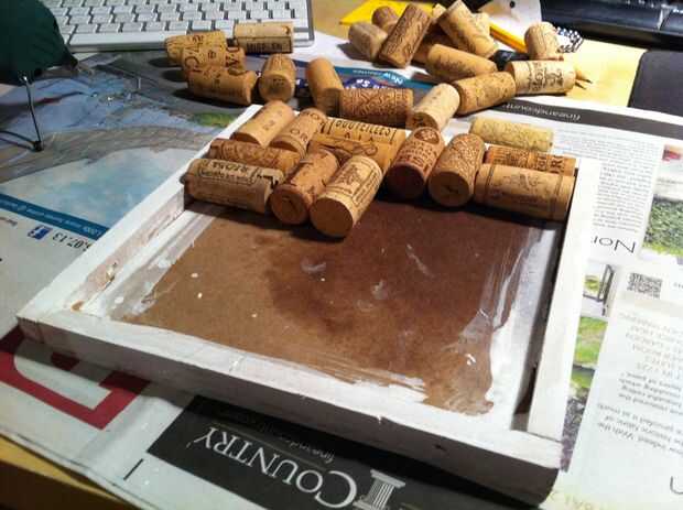 Pegamento caliente seca muy rápido así que pegamento en corchos uno por uno. Un montón de corchos tendrán escritura interesante o fotografías en tan trataran y conforman estos punto.