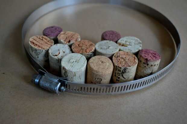 Como cortar, colocar los corchos vertical dentro de la abrazadera en una superficie plana. Dependiendo de su estilo, le gusta tener algunas de las porciones manchadas mirando para arriba para un poco de color.