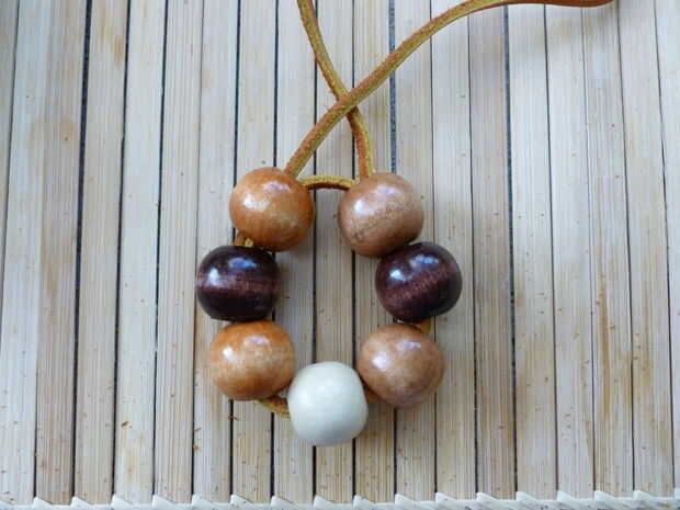 Cadena 7 granos centrados en al menos 42 pulgadas de cordón de cuero. La duración variará dependiendo de cuántas filas/número de granos de tamaño de granos. Tomar un extremo de la cuerda y ejecutarlo a través de las cuentas y volver a dónde está la otra longitud del cable. Prestar atención a la la tensión del cable para asegurarse de que los granos están poniendo plano y no demasiado apretados.