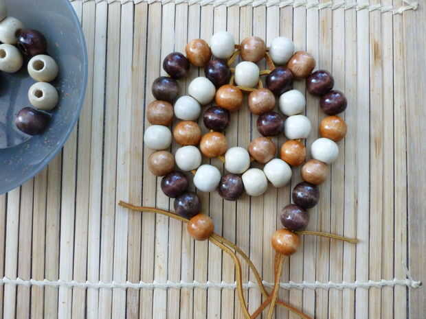 La fila final de la secuencia de la misma manera. Se ha añadido 10 cuentas para cada longitud de la cuerda. Cruce los extremos de la cuerda en cadena a través de los granos y volver hacia fuera en la parte superior del grano de 'lock' más añadido.