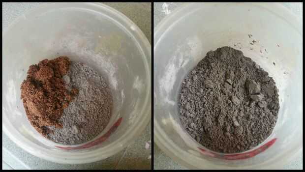 Vierta una pequeña cantidad de agua en la mezcla de arena y cemento y mezclar bien con el agua,