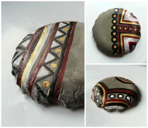 Usé pintura de tela negro, rojo, blanco y oro e hizo diseños tribales en ellos.