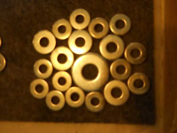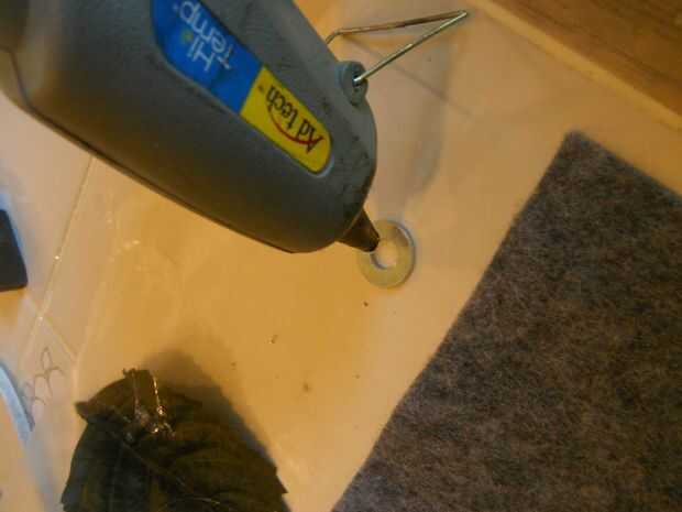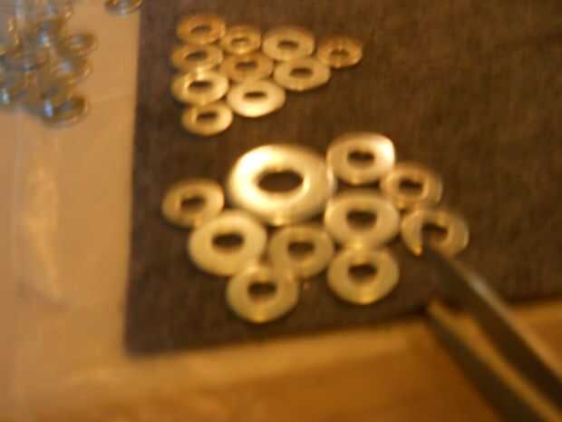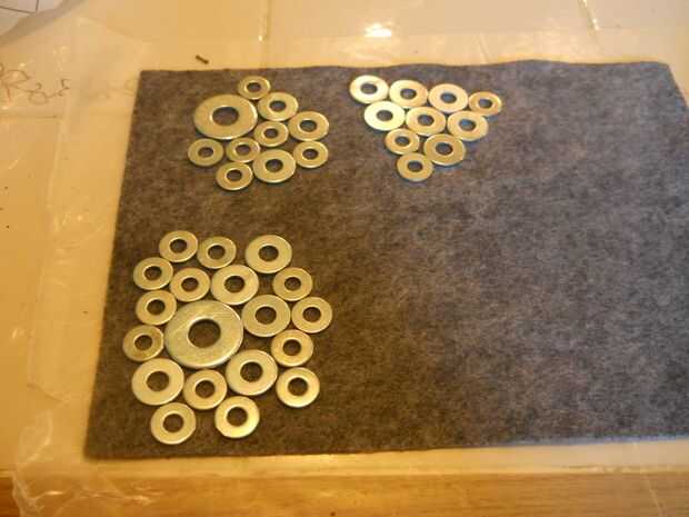 Disposición primera, sus arandelas en el fieltro en un patrón que te gusta. Luego, pieza por pieza, puso un punto de pegamento caliente en una lavadora y presione firmemente en el fieltro.