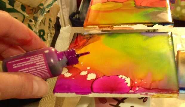 Extienda sus tintas en el orden que va a utilizar - esta parte va muy rápido porque la tinta comienza a extenderse de inmediato y se desea que los colores permanecerán en la sección que había planeado para ellos... Comience a caer el color en los azulejos mediante la adición de cada color para combinar en su patrón de elección.