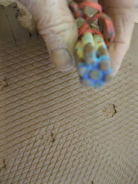 uso encontrado y artículos comenzó marcando la arcilla a mano. Estos son pequeños tacos grabados juntos para crear una flor como marca.