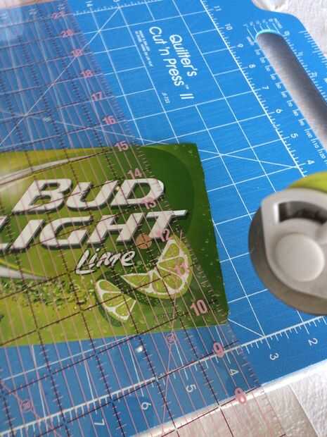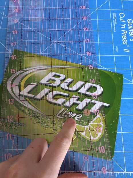 Al cortar el cartón, he tratado de mezclar los ángulos de las insignias. No quiero que todo sea perfectamente cuadrada. Tienes que tener cuidado con esto, porque si ese primer corte es demasiado inclinada, nunca obtendrás un cuadrado completo fuera de él. Esto es donde realmente ayuda la regla de la quilter. Porque es claro y tiene líneas en él, puede tener una idea de Dónde está la mejor parte del logotipo antes de hacer un corte.